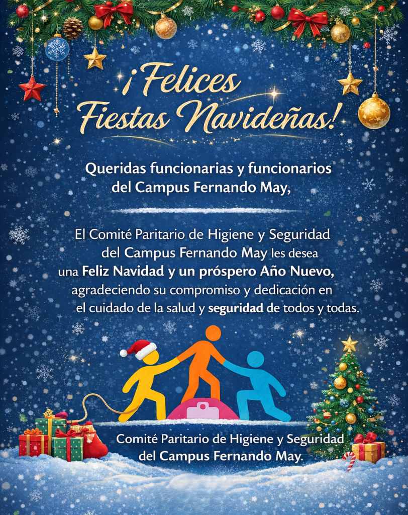 Publicado el jueves 18 de diciembre, 2025 SALUDO NAVIDEÑO Por CPHS Campus Fernando May Últimas Noticias 18 de diciembre, 2025 Comité Paritario del Campus Fernando May obtiene Certificación Plata de Mutual de Seguridad 18 de diciembre, 2025 SALUDO NAVIDEÑO 11 de diciembre, 2025 Comité Paritario del Campus La Castilla invita a funcionarias y funcionarios a responder cuestionario sobre ambiente laboral y salud mental 9 de diciembre, 2025 CEREMONIA DE CERTIFICACIÓN COMITÉ PARITARIO CAMPUS LA CASTILLA 20 de noviembre, 2025 El Comité Paritario de Higiene y Seguridad del Campus La Castilla participó en la “Feria de Seguridad y Servicios” organizada por la Municipalidad de Chillán + Noticias